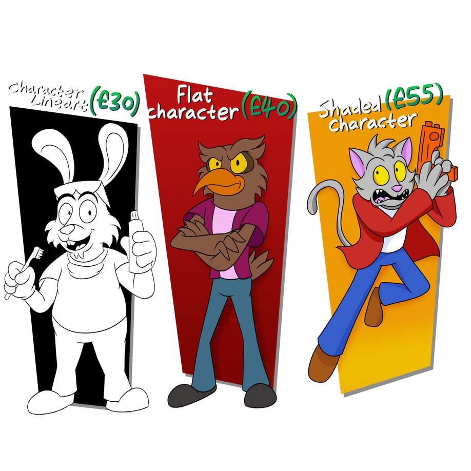 Extra character: + £30Basic colour/gradient/pattern: FREEMinimalist background: £20Complex background: £30-£40 (Depending on complexity)
